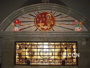 Santuario se aprecia un vitral y una placa conmemorativa "in memoriam" dedicada por los Frailes Franciscanos OFM; Hermanos